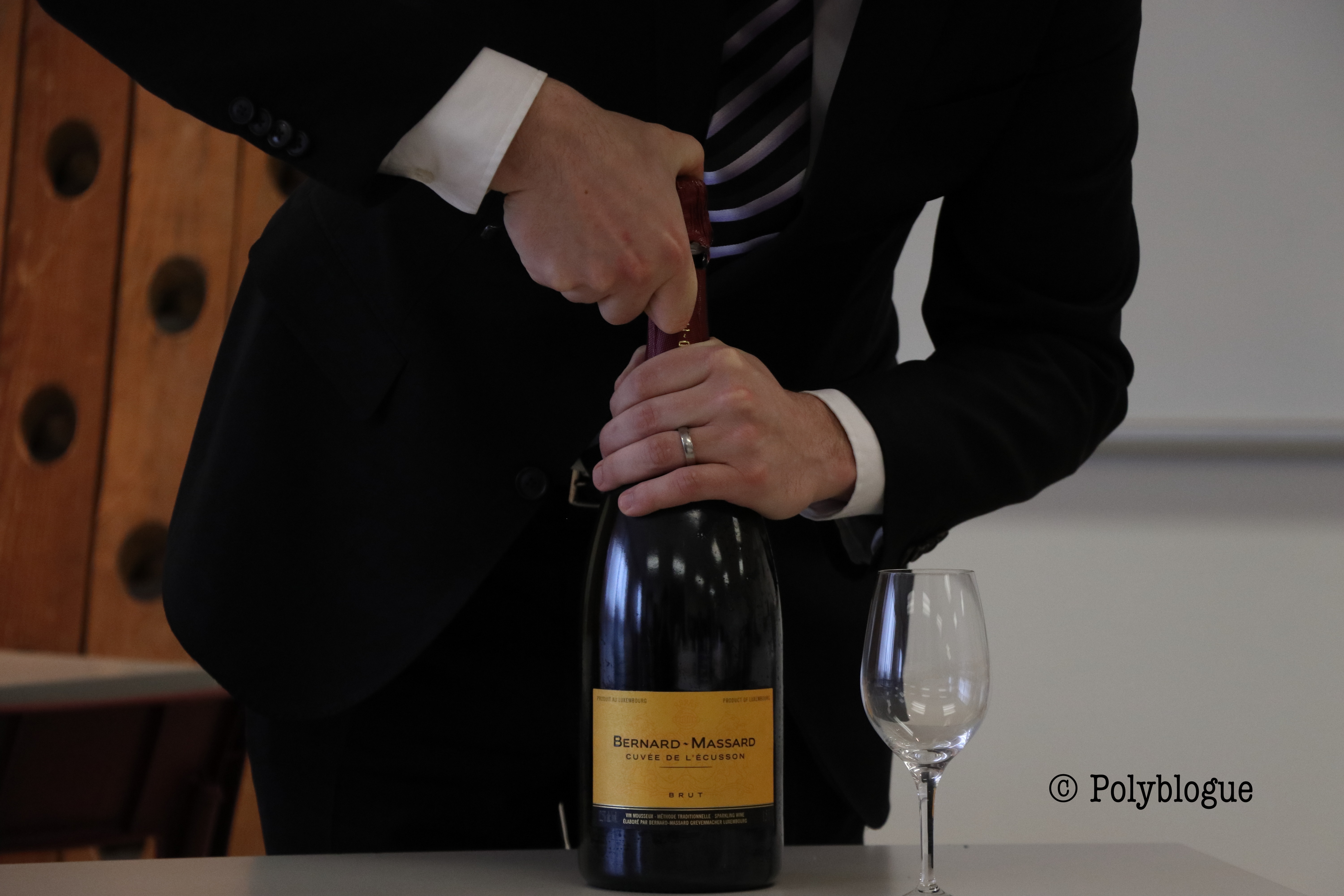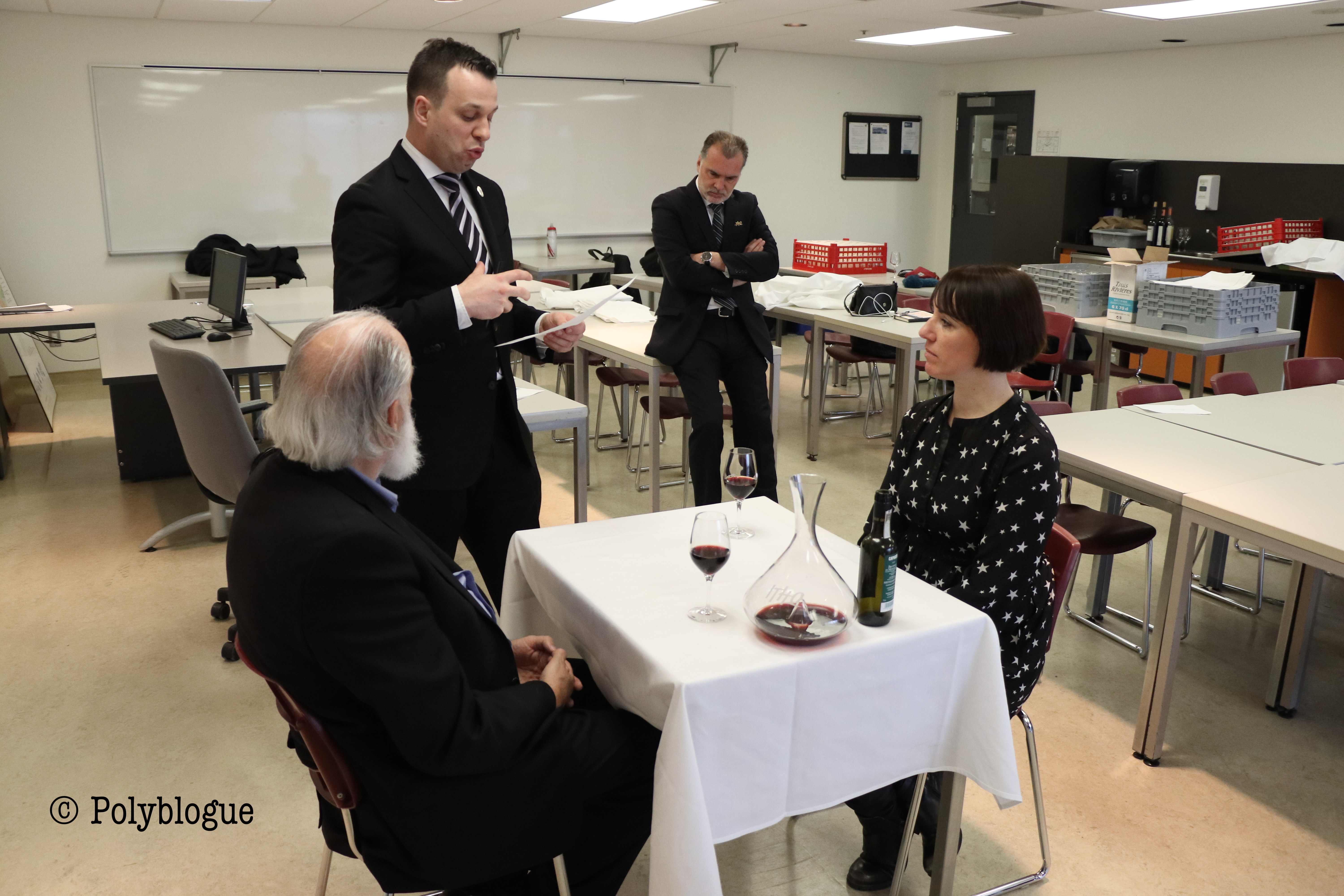 Les tables et les chaises se déplacent rapidement dans la salle de cours. Pendant que le candidat va reprendre son souffle, les bénévoles présents réaménagent l’espace pour la prochaine épreuve qui consiste à faire le service d’un magnum de mousseux du Luxembourg à une tablée de 12 personnes, tout en proposant des bouchées pour l’accompagner, en plus de faire des suggestions d’apéritifs à deux dames du groupe. Parmi les supporteurs de Pier-Alexis, on retrouve Hélène Dion, de l’agence Sélect Vins AdVini, Chloé Germentier, conjointe de Romain, le vice-président du chapitre québécois de l’Association canadienne de sommellerie, Daniel Carreau, de même que le sommelier François Marchal, aussi membre de l’exécutif de la division québécoise de l’ACSP. Tous surveillent étroitement chaque geste et chaque parole de leur concurrent. Mis à part, une toute petite faute au service, l’exercice se passe bien.