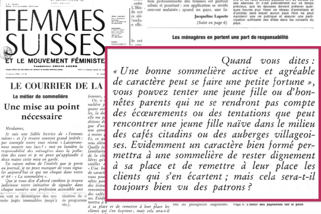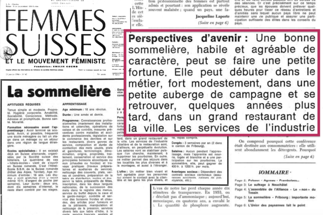 Dans un article publié dans le magazine féministe Femmes Suisses en 1966, on apprend que le métier de sommelière en est un d’avenir pour une jeune femme qui a les aptitudes requises. Et je cite : « Tenue simple et modeste. Propreté. Hygiène corporelle. Amabilité. Sociabilité. Conscience. Méthode. Adresse et promptitude. Bonne santé. Moralité. »