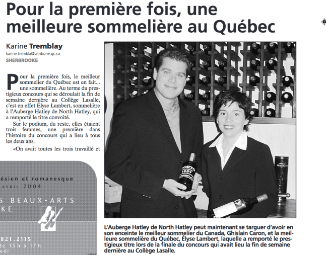 En avril 2004, lors de la finale du Meilleur sommelier du Québec, pour la première fois de l’histoire, une femme l’emporte. Élyse Lambert, alors à la réputée Auberge Hatley, met la main sur le titre. Mais ce n’est pas tout. Véronique Rivest arrive en deuxième place et Danielle Dupont est troisième. Un podium complètement féminin! Le plafond de verre ne brise pas, il explose!