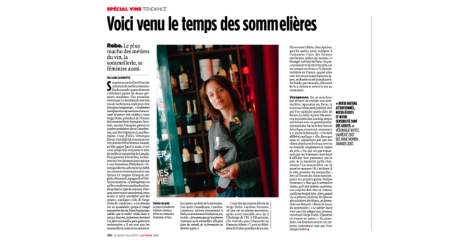 La consécration internationale vient avec des victoires au meilleur sommelier des Amériques en 2009 (Lambert) et 2012 (Rivest). Le mouvement est lancé. Si bien qu’en 2010, le magazine français Le Point s’émeut de voir quatre femmes dans les 12 premières au Concours du meilleur sommelier du monde, à Santiago. Le sous-titre dit tout: « Robe. Le plus macho des métiers du vin, la sommellerie, se féminise. » Et nos Québécoises Rivest et Lambert sont bien entendu au cœur du de l’action.