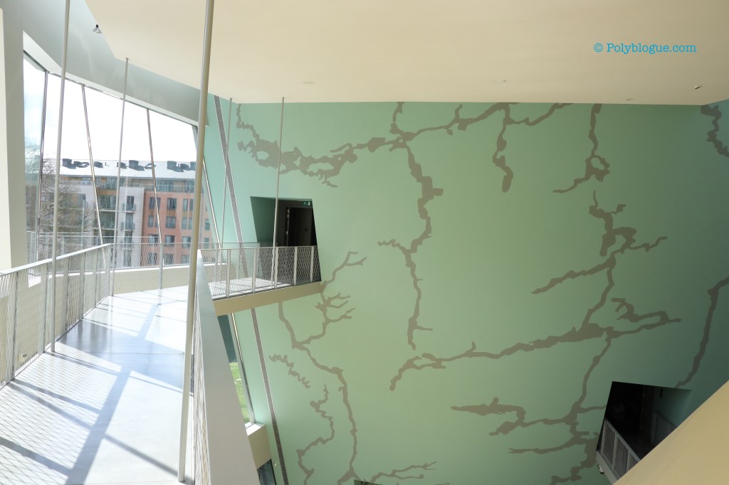 Les salles à l’éclairage tamisé sont reliées entre elles par des passerelles lumineuses ou de grandes fenêtres laissent passer la lumière du jour et offrent une autre perspective de l’intérieur du musée.