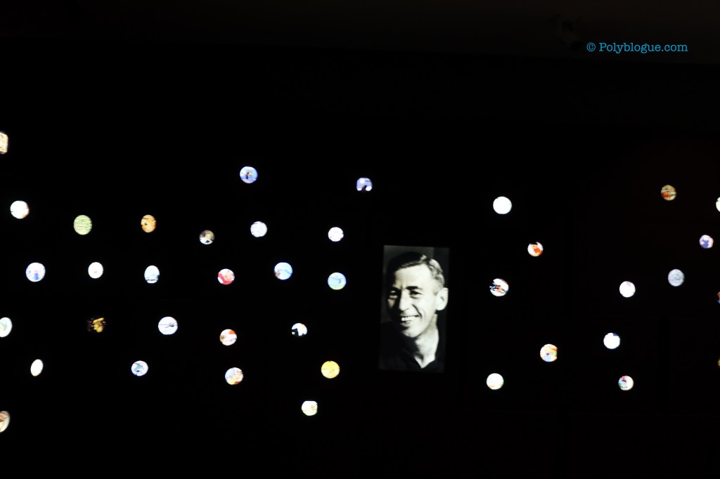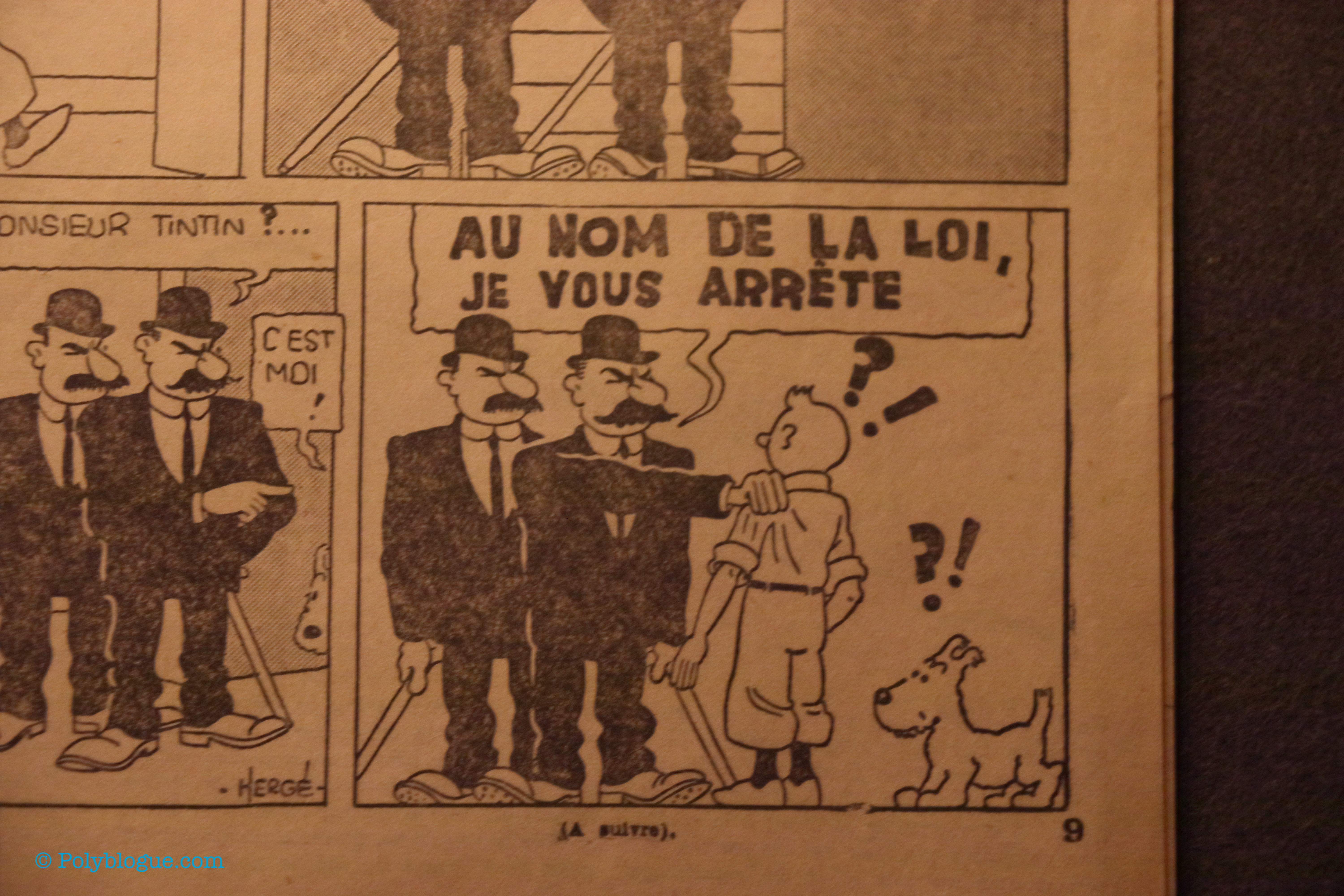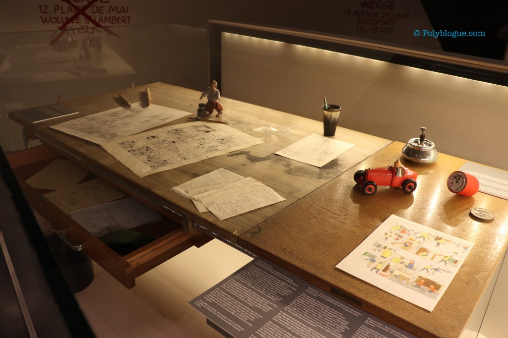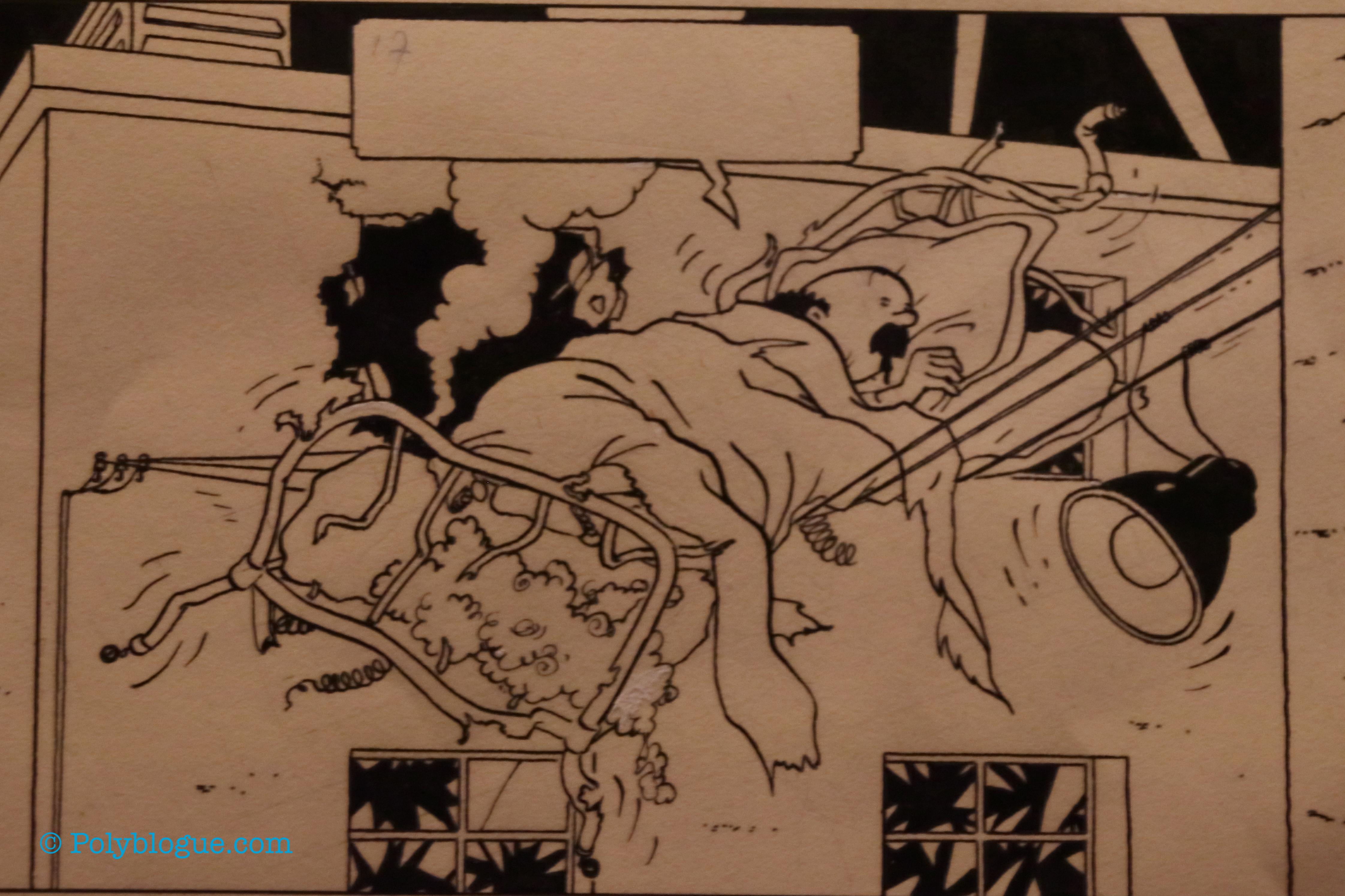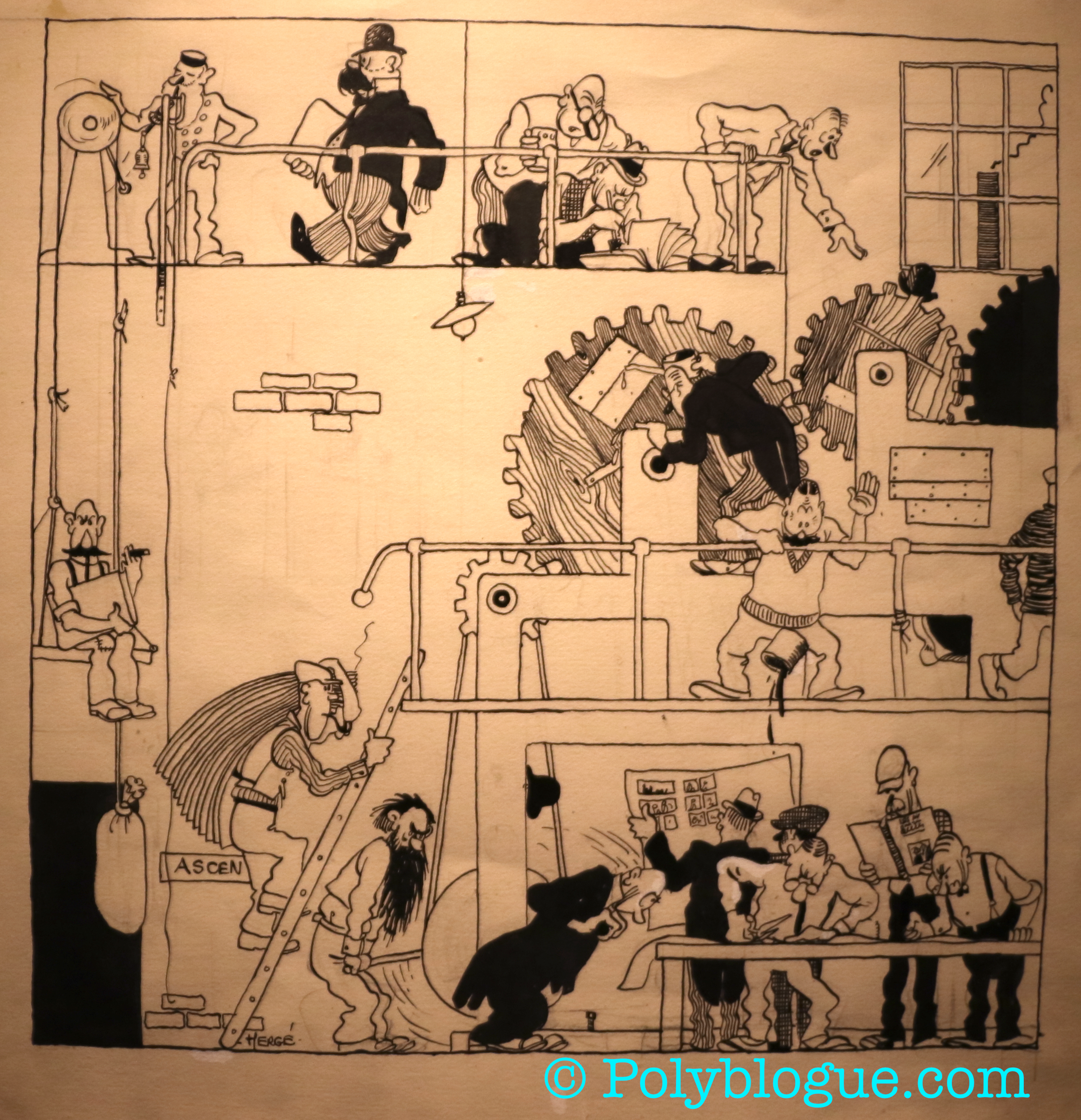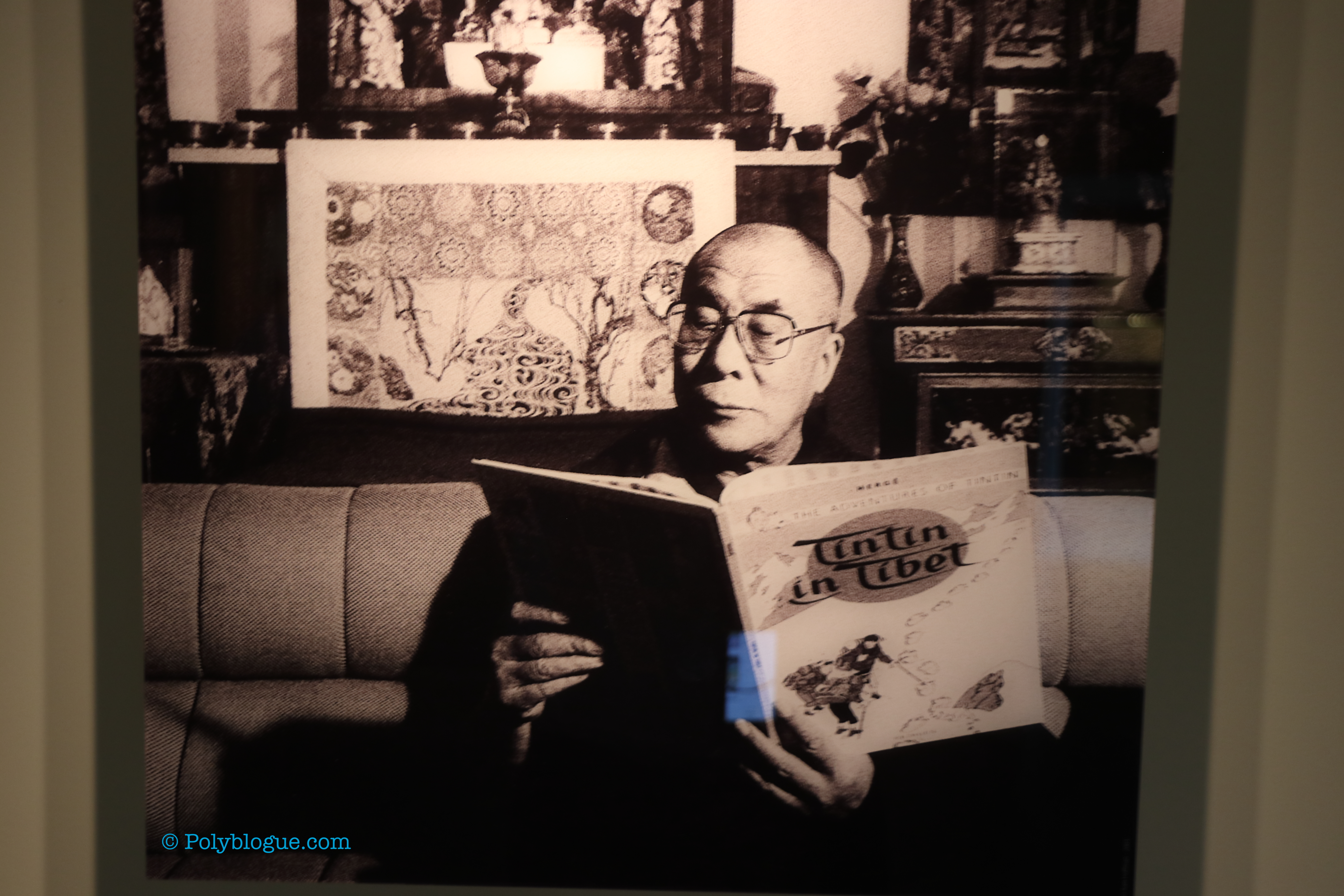 On commence la visite par le 3e étage, et aux premiers pas, bande sonore à l’appui, on a l’impression de revenir dans le temps. L’intérieur de la salle est sombre. Sur des murs noirs, les dessins du maître se succèdent à l’intérieur de toutes petites bulles et côtoient quelques photos de Georges Rémi (le vrai nom de l’artiste).