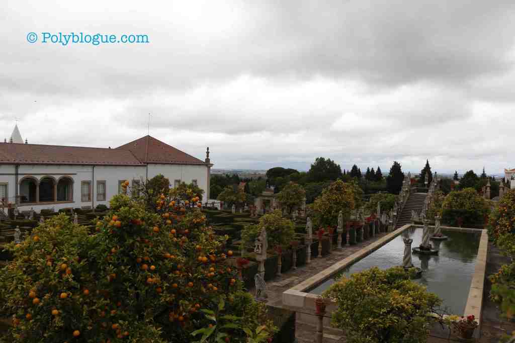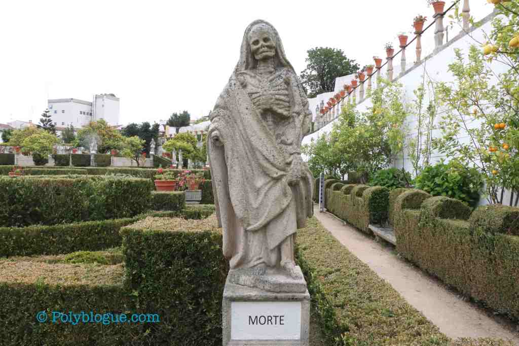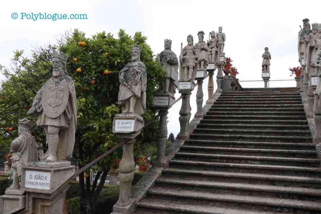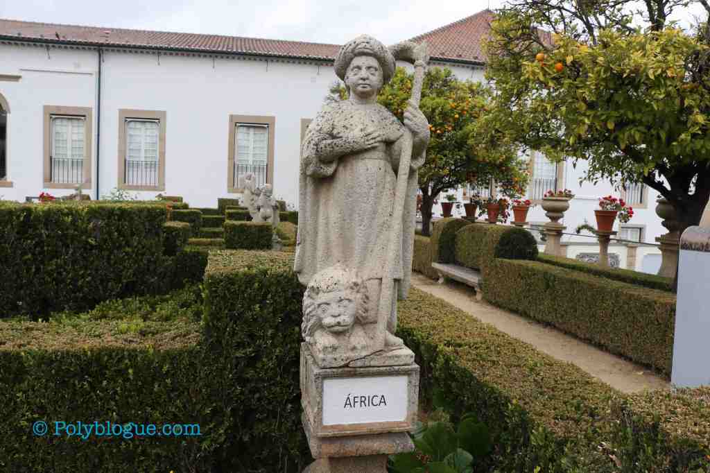 On s’attarde aux étonnants jardins du palais épiscopal. Le ciel orageux donne une apparence un peu sinistre à cet endroit où on s’est amusé à disposer des statues pour un oui ou pour un non. Statues représentant les signes du zodiaque, quelques saints, des anges, des continents, l’enfer et les rois du Portugal. À noter que les représentations des monarques d’origine espagnole sont beaucoup plus petites que celles des portugais.