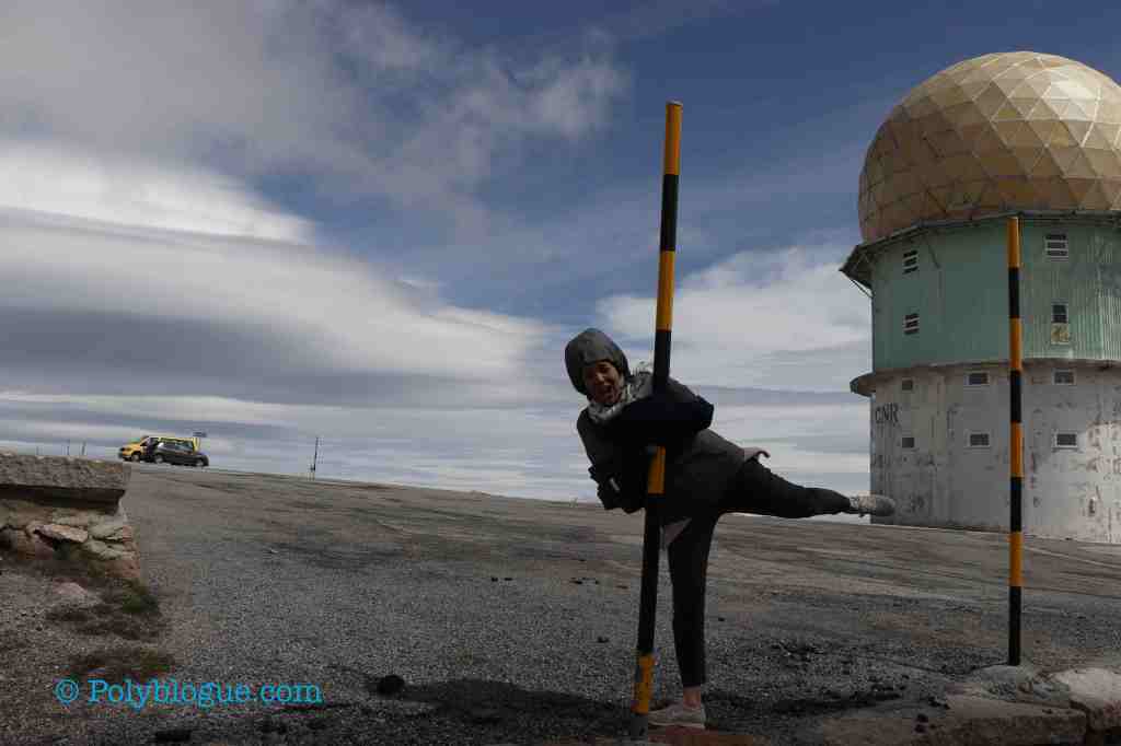L’arrivée au sommet du Torre est à couper le souffle… littéralement! Il vente si fort qu’on est constamment repoussé dans notre progression pour aller au bout de l’observatoire. Ici, il y a encore de la neige. Avec le vent, on doit être sous zéro.