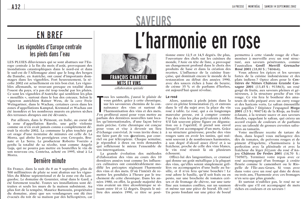 Et comment! L’auteur de Papilles et Molécules en sait quelques chose. Il y a 17 ans, alors qu’il signait une toute première chronique dans La Presse, la place des rosés à table avait été le tout premier sujet qu’il avait abordé. En voici un extrait: