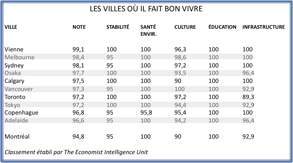 Eh bien, une chance, non! C’est du moins ce qu’indique la dernière étude du Economist Intelligence Unit, compagnie sœur du réputé hebdomadaire britannique The Economist.