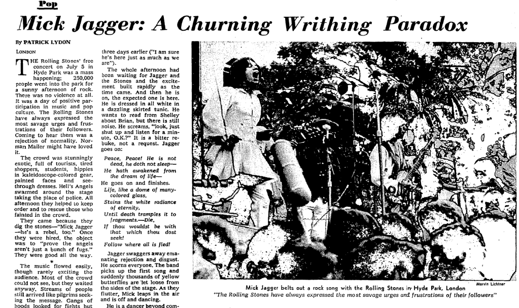 Les tambours continuent. Il (Mick Jagger) a fait son travail. Il envoie des baisers et quitte. Pour ceux qui n’y étaient pas, la musique fut décevante. Ceux qui ont aimé Brian Jones doivent se dire qu’il est désormais disparu et oublié. Chacun des papillons est mort.