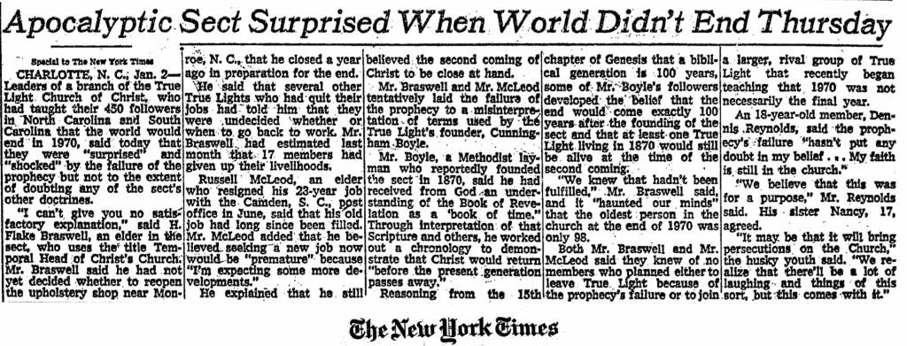 Le journaliste, dont le nom n’apparaît pas, nous apprend que les dirigeants d’une branche de la True Light Church of Christ sont renversés de constater que le monde n’a pas pris fin la veille.