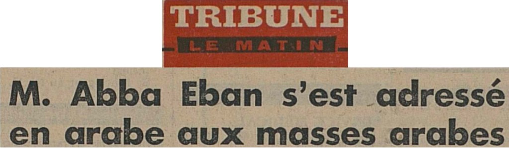 Et c’est pertinent de le souligner, parce que monsieur Eban est alors ministre israélien des Affaires étrangères. Il s’adresse aux peuples arabes via la télévision israélienne pour les inciter à revenir à la table de négociations. Là, c’est un peu moins pertinent. Il a beau parler arabe, je ne suis pas certain que le public qu’il vise va le regarder sur cette chaîne.