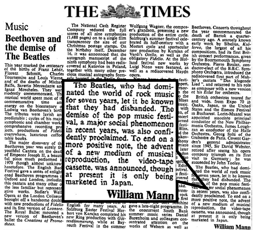 Dans le Times de Londres, le premier de l’an est l’occasion de faire la revue des événements de tous les domaines. Dans la revue musicale, William Mann consacre son article à la musique classique et plus particulièrement au 200e anniversaire de naissance de Beethoven et termine avec ce paragraphe :