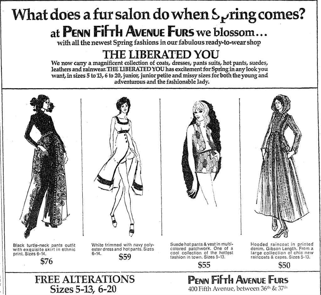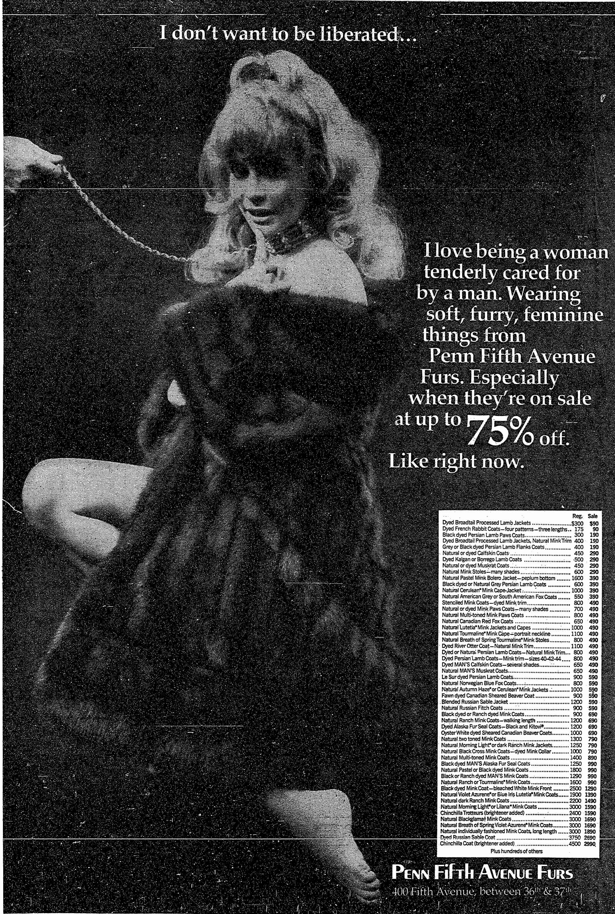En regardant cette publicité d’un magasin de fourrure publiée en avril 1971, on peut croire que les agences de publicité de Madison Avenue avaient rapidement saisi l’importance du women’s lib.