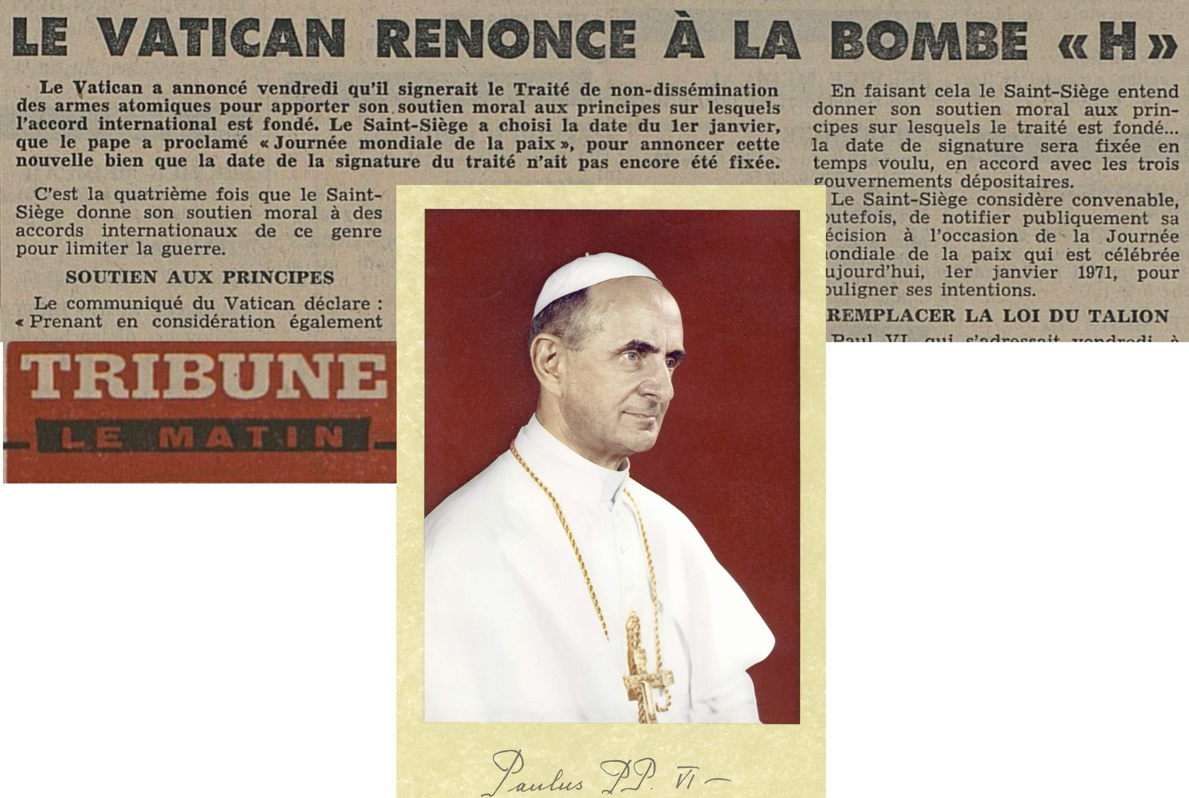 Mais, ce n’est pas tout à fait ça. Le Vatican annonce en ce premier janvier 1971 – proclamé Journée mondiale de la paix par le Pape Paul VI – qu’il signera le traité de non-dissémination des armes atomiques pour apporter son soutien moral aux principes sur lesquels il est fondé.