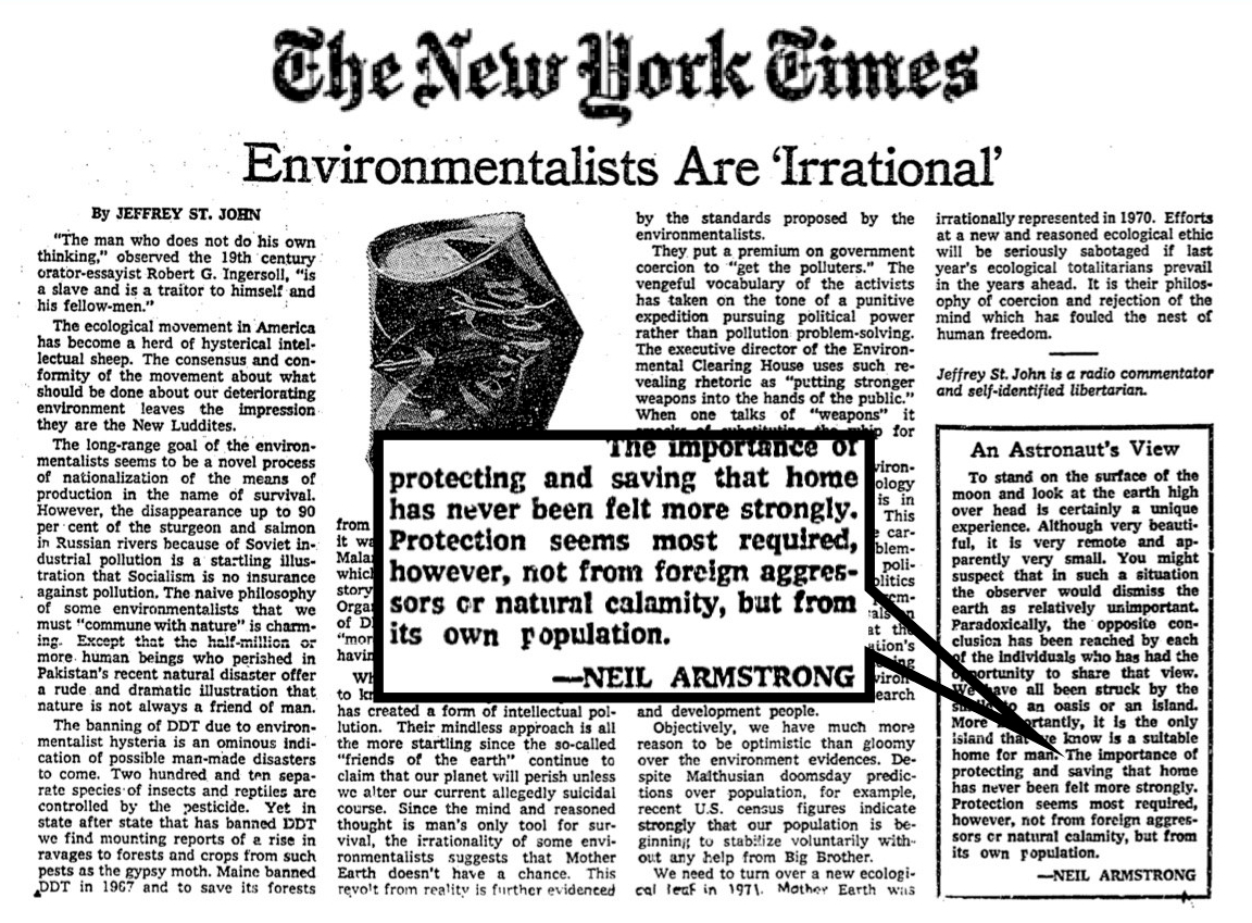 Le même jour, le populaire commentateur radiophonique Jeffrey St. John signe un papier d’opinion dans le New York Times où il écrit notamment : « Le mouvement environnemental aux États-Unis est devenu un hystérique troupeau de moutons idéologique. (…) Leur approche insensée est d’autant plus étonnante que ces soi-disant amis de la Terre continuent à clamer que notre planète périra à moins de modifier notre prétendu parcours suicidaire. »
