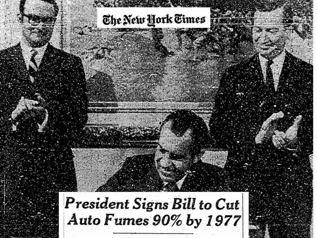 Au tournant des années 70, on commence à parler beaucoup plus sérieusement d’environnement. À tel point que le premier janvier 1971 le Président américain Richard Nixon signe une loi qui vise à réduire de 90 % les émissions polluantes des automobiles en l’espace de six ans! Lors de la cérémonie, Nixon assure que « ce n’est que le début! »